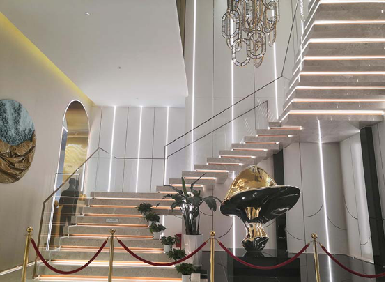 營銷中心體驗區(qū)的施工特點及難點主要在于異形不銹鋼的施工、材料種類多導(dǎo)致加工工序多、石材旋轉(zhuǎn)樓梯難度大等方面,深圳千里馬裝飾集團有限公司施工隊伍不畏困難,堅持“工匠精神”不動搖,把品質(zhì)、工期和客戶滿意度放在第一位,給客戶提交了一份滿意的答卷。